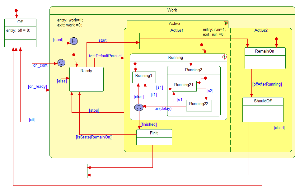 Das in der UML standardisierte Statechart ist im wesentlichen von David Harel in den 80-ger Jahren entwickelt wurden und im Tool https://de.wikipedia.org/wiki/Statemate erstmalig etabliert. Es wurde mit Augenmerk auf komplexe System in praktischen Anwendungen entwickelt und kennt sowohl geschachtelte States (internes Verhalten in einem übergeordnetem State), Parallität von Abläufen, Fork- und Join-Syncbar. Letzteres erinnert an Petri-Netze und hat wohl dort möglicherweise seinen Ursprung. StateMachines in UML können entweder Event-getriggert werden, oder zyklisch ablaufen. In beiden Fällen sind Bedingungen für das Schalten definiertbar. Bei Eventtriggerung ist folgendes Prinzip wichtig: Wenn ein Event im aktuellen Zustand nicht verarbeitet werden kann, dann verfällt es. Mit diesem Prinzip wird ein unerwartetes Verhalten aufgrund eines alten gespeicherten Events vermieden. Das Prinzip ist allerdings aufgeweicht durch die mögliche Definition von dereferred Events, vom Autor nicht empfohlen.