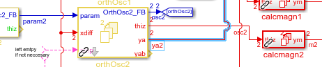 Die Idee ist, Funktionsblöcke in Simulink als Object-FB und Operation-FB zu untergliedern und mit Referenzen zu verbinden. Das Bild rechts zeigt zwei Object-FB, param2 ist als Aggregation auf OrthOsc2_FB verbunden. calcmagn2 ist ein Operation-FB. Die Referenzen sind in Simulink Handle, die einen Index auf eine globale Adresstabelle darstellen. Die Adressen selbst sind damit intern. Die Adressen stehen in