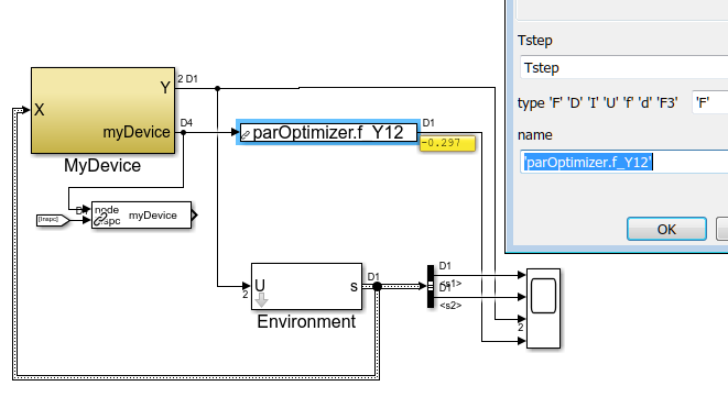 The FBlock f_Y12 is an instance of get_DataStruct_Inspc. It uses the thiz output via Goto-From-data connection. This FBlock is used to access a value from the DataStructMng_Inspc thiz. Its output is named f_Y12_z because it is the value from the last step time. It acts as unit delay. The DataStructMng_Inspc writes the data in the mdlUpdate routine as last action of the step time, so the access is done to the value from the previous step time. With them a numeric